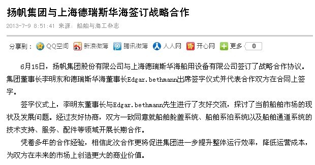 船舶與海工:揚(yáng)帆集團(tuán)與上海德瑞斯華海簽訂戰(zhàn)